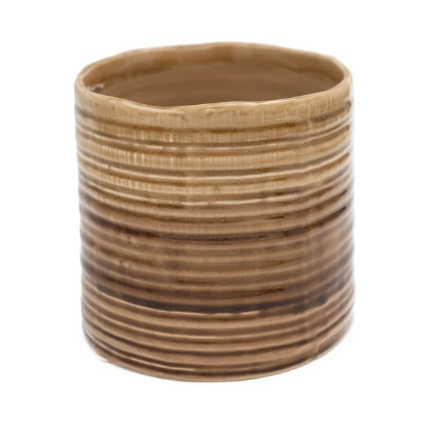 Stilig potteskjuler av keramikk med brunstripete blank overflate. Beregnet til innendørsbruk. Mål: Ø16,5 cm, høyde: 15 cm.
