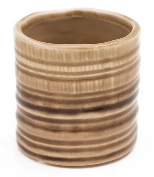 Stilig minipotte av keramikk med brunstripete blank overflate. Beregnet til innendørsbruk. Mål: Ø7 cm, høyde: 6,7 cm.
