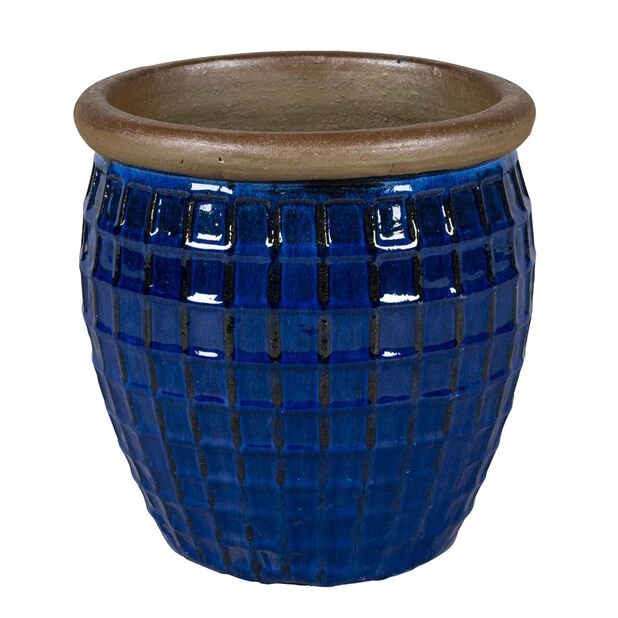 Moderne, glasert leirpotte med lekfullt rutemønster i vakker blåfarge. Potten er beregnet for utendørsbruk, med dreneringshull i bunnen. Mål: Ø40 cm, høyde: 40cm.