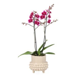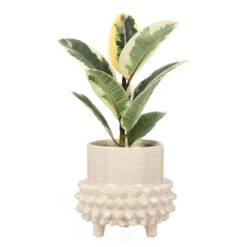 Tilfør hjemmet en følelse av ro og eleganse med denne potten stilige konturer! Potten Elin har en glasert overflate med boblete form nederst og blank, stripete form helt øverst. Den har også stilige ben som løfter opp favorittplantene dine enten om det er i stuen, på soverommet eller til og med på badet. Med blomsterpotter i ulike former, farger og materiale kan du enkelt gi hjemmet ditt en personlig og lun atmosfære. Innred med planter i stuen, på badet – ja hele hjemmet og la deg inspirere av mange vakre blomster i fine potter!