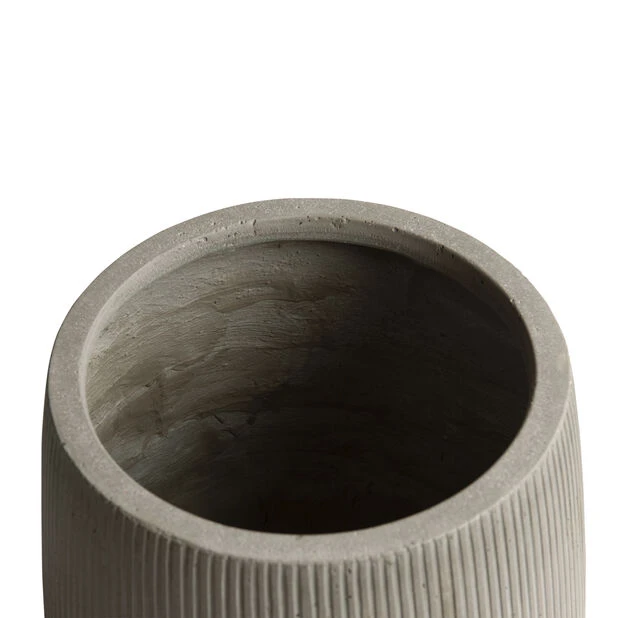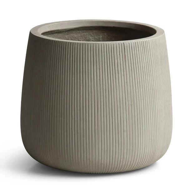 Moderne og stilig potte til utendørsbruk i frostsikker lettvektssement med hull for drenering.