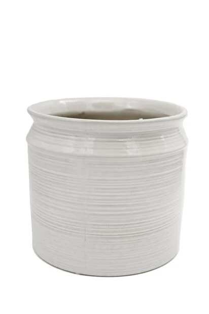 Rustikk, hvit potte i stengods med dekorative dreiestriper som gir potten en vakker bølgende form. Innred hjemmet med en klassisk potte som fremhever plantens farger! Glasert potte i leire for innendørs bruk.