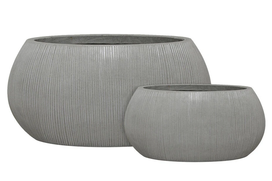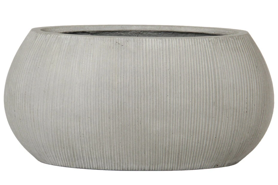 En moderne plantekasse i frostsikker lettsement med et fint, ribbet mønster. Plantekassen har hull i bunnen for drenering. Lengde: 46 cm, bredde: 23 cm, høyde: 22 cm.