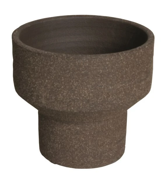 Moderne rund potte av keramikk med dekorativ avsmalning nederst. Overflaten er matt, litt knudrete og ru. Beregnet til innendørsbruk. Mål: Ø26 cm, høyde: 23 cm.