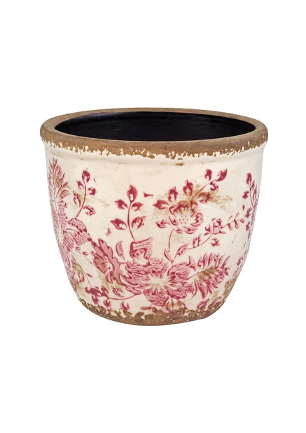 Antikk potte med rosa blomster. Denne keramikkpotten er håndlaget og har et tidsriktig utseende. Potten har en tynn plastinnsats, men den bør kombineres med en tett innerpotte, et potteunderlag eller vanntett fat som beskytter mot fukt på underlag. Diameter: 16 cm, høyde: 13 cm. Passer til innerpotte med diameter 12 cm.