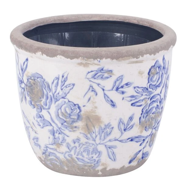Antikk potte med blå blomster. Denne keramikkpotten er håndlaget og har et tidsriktig utseende. Potten har en tynn plastinnsats, men den bør kombineres med en tett innerpotte, et potteunderlag eller vanntett fat som beskytter mot fukt på underlag. Diameter: 25 cm, høyde: 20 cm. Passer til innerpotte med diameter 19 cm..