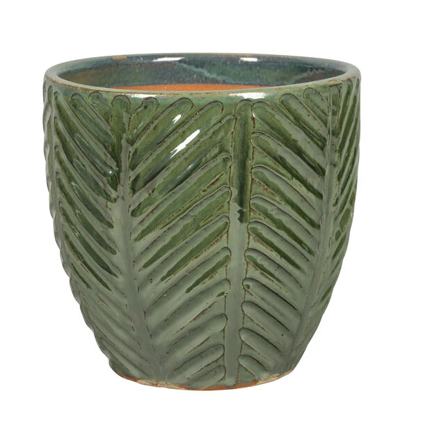 Fin, rund potte i keramikk med dekorativt fiskebeinsmønster og blankglasert finish. Beregnet for utendørsbruk. Diameter: 27 cm, høyde: 26 cm. Frostsikker med dreneringshull i bunnen.