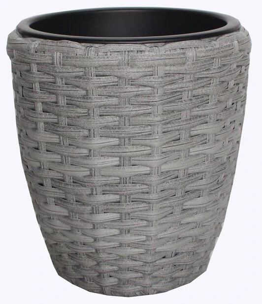Moderne kurvpotte i håndvevd, grå kunstrotting. Svart, tett plastpotte på innsiden som sikrer at jord og vann ikke lekker ut. Mål: Ø 28 cm X H 30 cm med innvendig mål på Ø 21 cm.