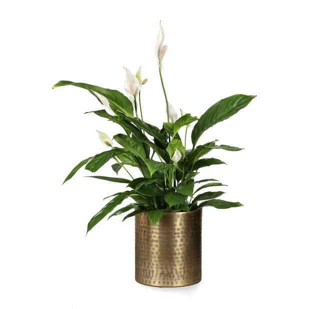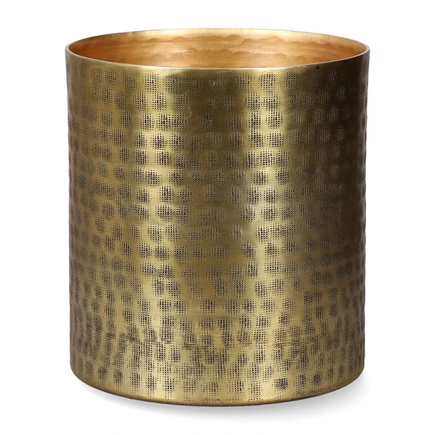 Moderne messingfarget potte med hamrede detaljer. Flott som kontrasterende innramming til grønnplanter. Beregnet til innendørsbruk. Mål: Ø20 cm, høyde: 22 cm.