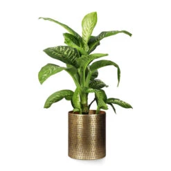 Moderne messingfarget potte med hamrede detaljer. Flott som kontrasterende innramming til grønnplanter. Beregnet til innendørsbruk. Mål: Ø24 cm, høyde: 28 cm.