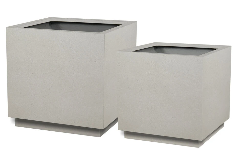 Moderne og stilig, firkantet potte til utendĂžrs bruk i frostsikker lettsement med dreneringshull. Lengde og bredde: 28 cm. Nova D firkantet fat: 28 cm passer her.