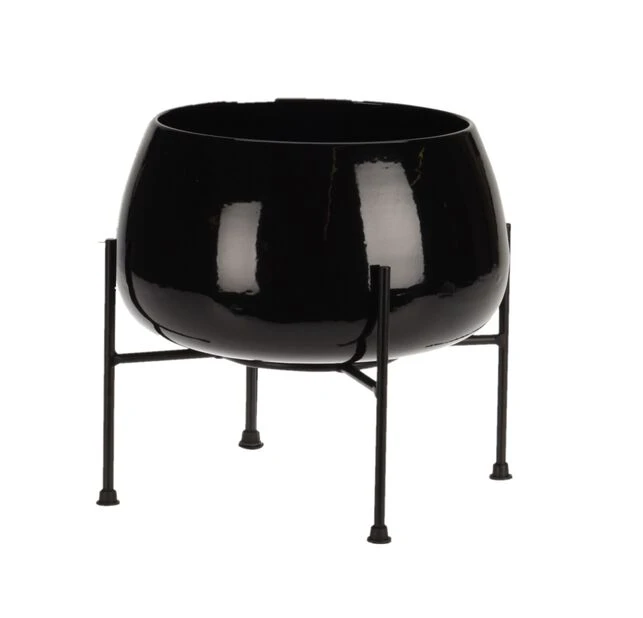 Stilig og moderne svart potte i metall med liten pidestall. Perfekt når man vil heve plantene litt opp fra gulvet. Beregnet til innendørsbruk. Mål: Ø27 cm, høyde: 26,5 cm.