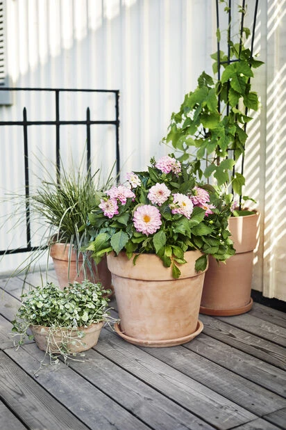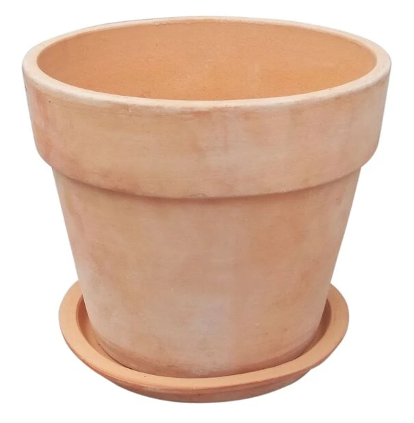 Tradisjonell, uglasert terrakottapotte med tilhørende fat som sitter fast på potten. Perfekt til krydderplanter og grønnsaker, samt romantiske blomster.