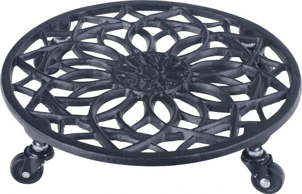 Praktisk og stødig potteunderlag med hjul i smijern. Gjør det enklere for deg å gjøre rent eller flytte rundt på blomster og planter uten å måtte løfte dem. Passer både ute og inne, og kan også brukes til store potter på balkongen eller terrassen. Kraftige gummihjul med metallholdere. Tåler en belastning på opptil 45 kg. Diameter 31 cm.