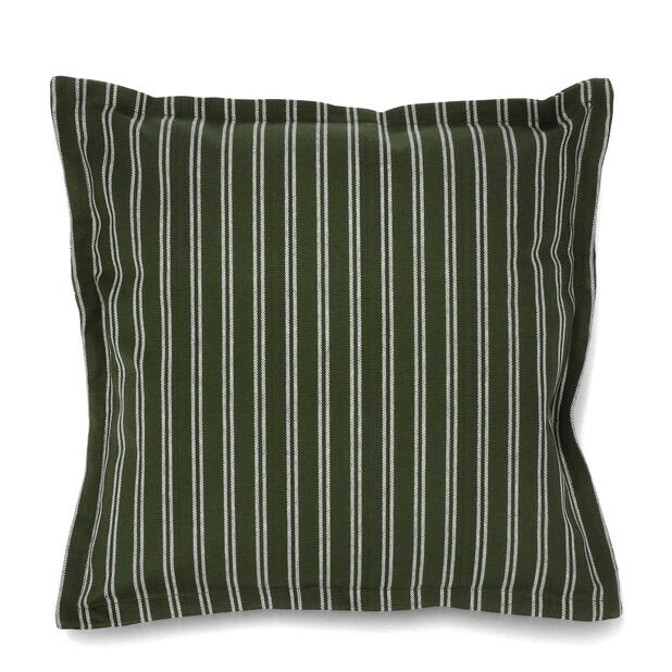 Klassisk grønn pute med stilige hvite striper. Vannavvisende bomulltrekk med polyesterfyll og glidelüs i bunn. Oeko-tex-sertifisert, fri for helseskadelige kjemikalier. Til innendørs- og utendørsbruk.