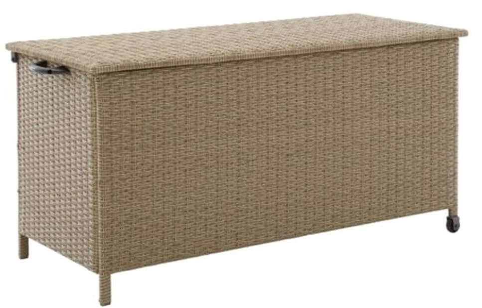 Romslig putekasse i naturfarget kunstrotting. Perfekt oppbevaringsløsning til hagen eller balkongen. Med hjul for enkel flytting. Mål: 160 x 80 cm, høyde 80 cm.