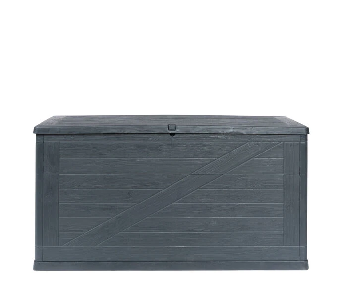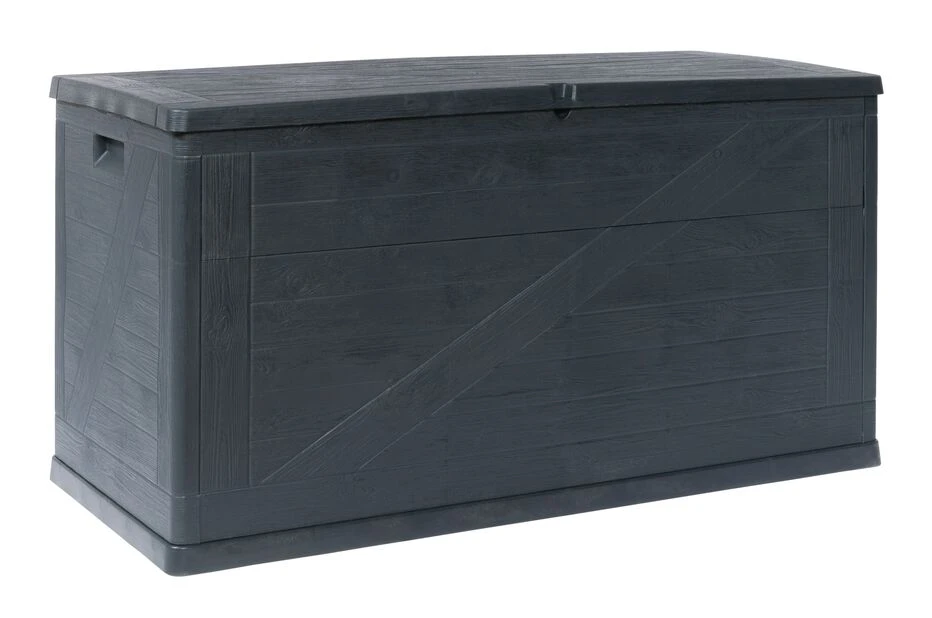 Romslig putekasse til oppbevaring av puter. Vanntett oppbevaringsløsning for terrasse og hage. Putekasse i plast med et trelignende ytre. Mål: 120 x 56 x 63 cm, 420 l.