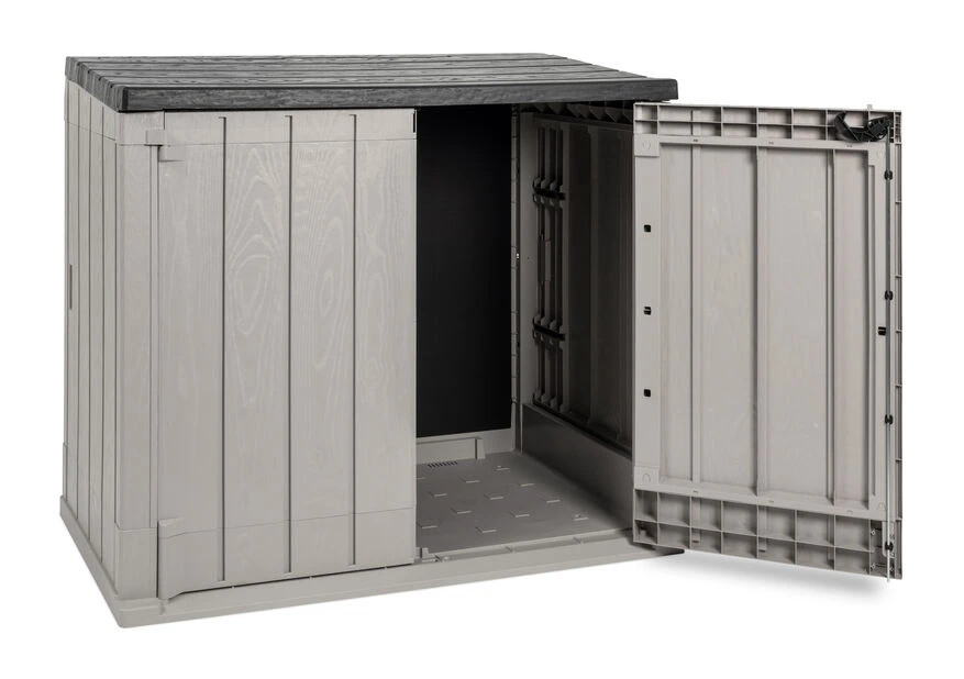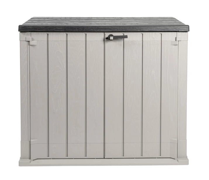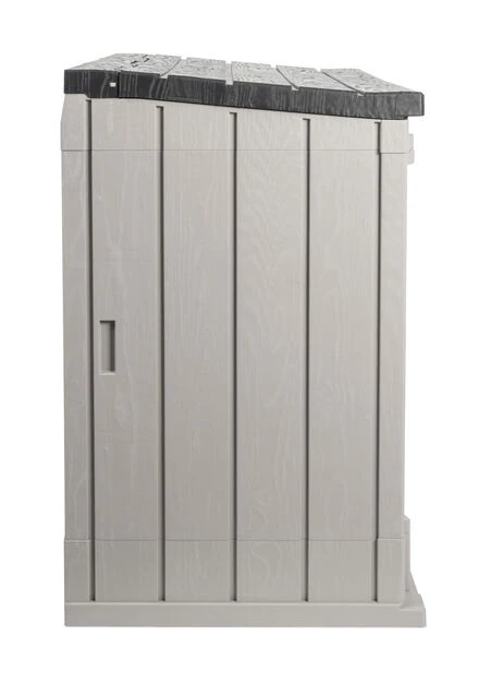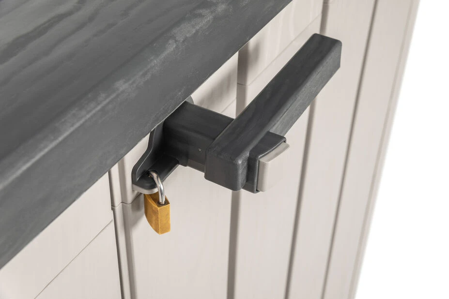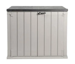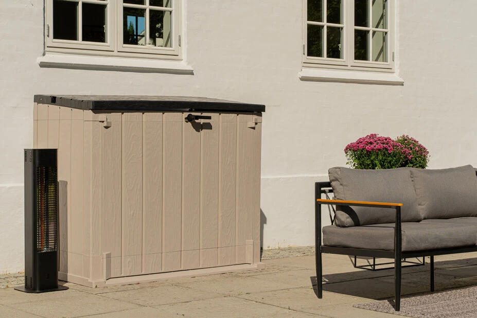 Hold din puter, pledd og duker tÞrre med en praktisk putekasse. Putekassen Othelie er designet som et skjul med to overlappende tredÞrer som stenges med et lÄsbart hÄndtak. LÄsen er festet nederst pÄ putekassen for sikrere oppbevaring. Putekassen er UV-bestandig, vanntett og frostsikker, og kan stÄ utendÞrs hele Äret. Putekassen er laget i grÄ PP-plast med et trelignende ytre. Enkel montering.