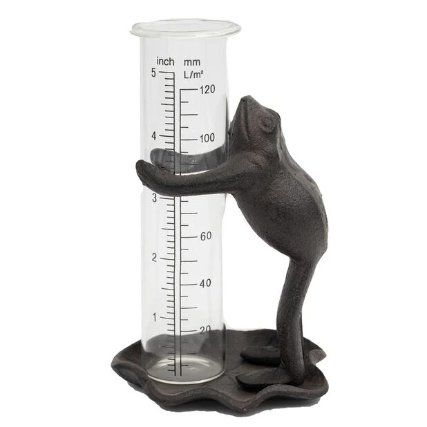Dekorativ regnmåler med en søt frosk i støpejern og målerglass som er lett å lese av. Høyde: 14 cm.