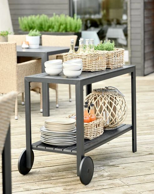 Med et flott og praktisk rullebord får du raskt et ekstra avlastningsbord på terrassen eller i hagestuen. Rullebordet Rimini er et stabilt sidebord med to hjul som kan brukes både som ekstrabord eller som en smart serveringsvogn. Holder seg fint sesong etter sesong takket være de vedlikeholdsfrie materialene aluminium og nonwood. Kombiner gjerne med de øvrige bordene i Rimini-serien for en enhetlig stil. Krever montering.