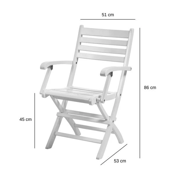 Skap et hyggelig rom på balkongen og uteplassen med en klassisk kaféstol! Sammenleggbar kaféstol Risør er en klassisk stol i kafédesign som egner seg godt til mindre arealer, f.eks. på balkongen eller en mindre uteplass. Stolen er laget av FLEGT-merket, sertifisert og resirkulerbar mahogni som er malt hvitt med værbestandig PU-maling for et elegant inntrykk. Skruene har combifix-hoder som er overflatebehandlet med messing, og gjengestengene består av rustbestandig jern. Kaféstolen kan slås sammen for at du enkelt kan frigjøre plass, og for plasseffektiv oppbevaring når stolen ikke er i bruk. Hvis du vil ha et komplett kafésett, kan du kombinere stolen med det matchende bordet i Risør-serien som selges separat. Mål: Høyde 86 cm, bredde 51 cm, setehøyde 45 cm, setedybde 53 cm.