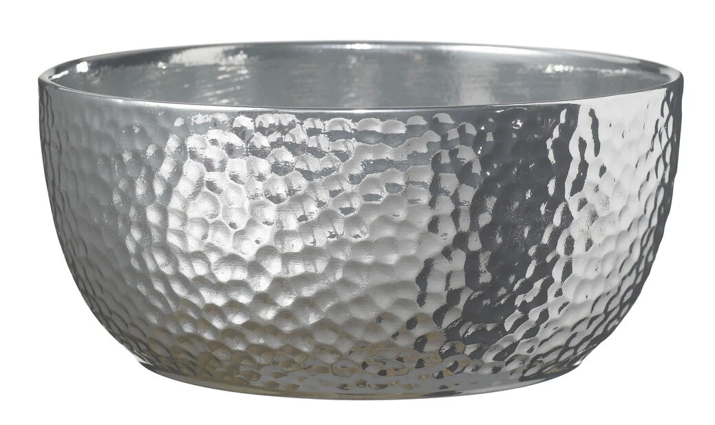 Fin sølvfarget skål med en mykt formet, levende overflate. Passer utmerket til samplantinger. Diameter: 20 cm.