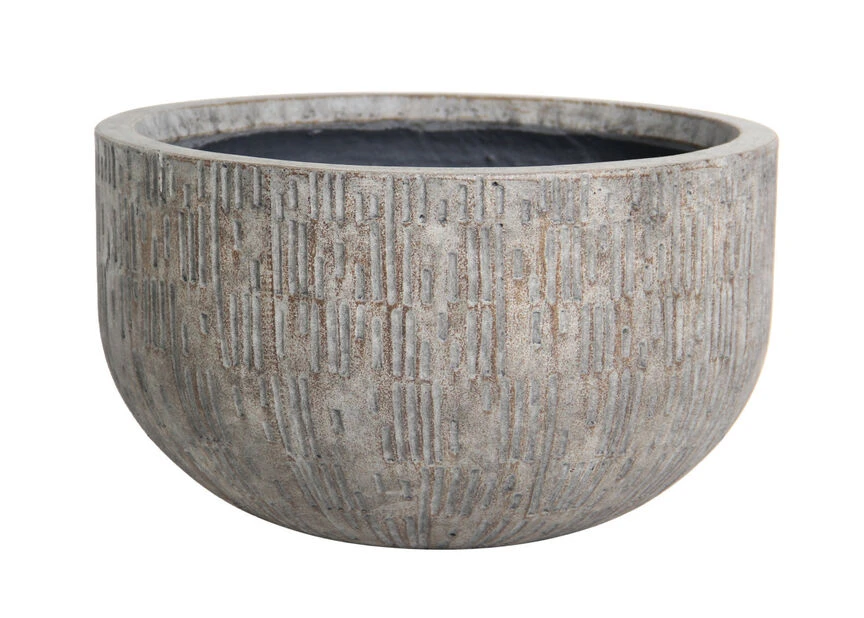 Skål Milo av glassfiber, sement, sand og stein gir en lett skål som dessuten er robust og ikke minst vakker. Skålen har et spennende, lineært mønster. Har dreneringshull. Frostsikker. D 35 cm x H 23 cm.