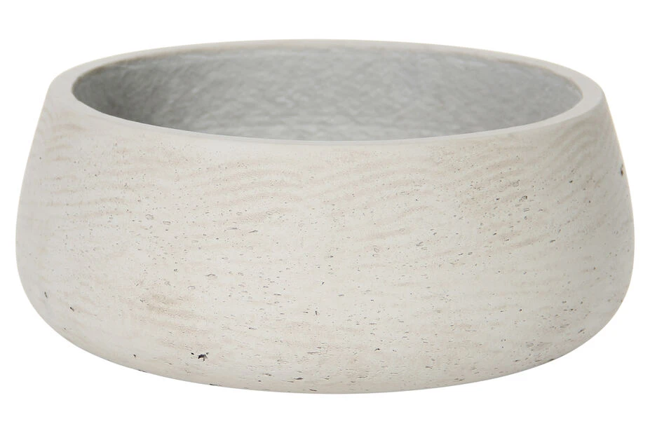 Skål i stilren sement til utendørs bruk. Plasseres under tak dersom det regner mye. Diameter: 22 cm, høyde: 9,5 cm og passer til innerskåler med en diameter på 17 cm.