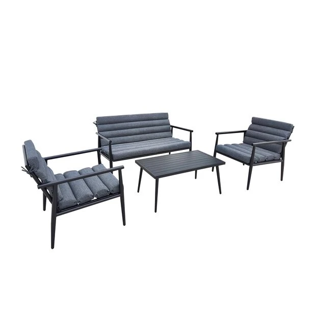 Moderne og minimalistisk sofagruppe i svart aluminium. Settet bestÄr av sofa, to stoler, et bord og flotte puter med avrundet design.