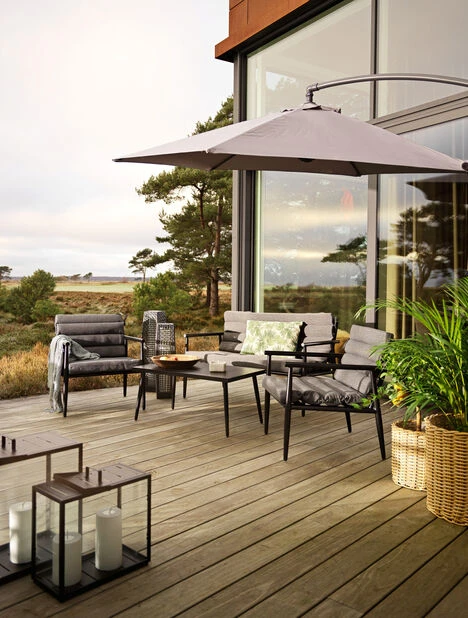 Den nette sofagruppen Lagos har en minimalistisk stil som passer i moderne hjem. Designen med rette, rene linjer og trendy, sylinderformede sitteputer gjÞr denne sofagruppen til et blikkfang pÄ terrassen eller i hagestuen. Den svarte rammen er laget av UV-bestandig, pulverlackert aluminium, og putene er laget av vÊrbestandig, vevd polyester (230 g/m2).