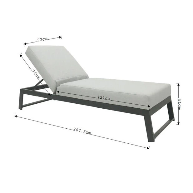 Solseng Toluca er en moderne solseng av hÞy kvalitet med nÞye utvalgte materialer. Solsengen er laget av robust, pulverlakkert aluminium med innsatser i rustfritt stÄl. Trekket bestÄr av det vÊrbestandige stoffet olefin i en vakker grÄ farge som tÄler vÊr og vind. Fyllet bestÄr av Quick Dry Foam som bidrar til at putene tÞrker raskere, og gjÞr solsengen optimal for utendÞrs bruk fra vÄr til hÞst. MÄl: lengde 207,5 cm, bredde 72 cm, hÞyde 41 cm. Maksimal vektbelastning: 120 kg.
