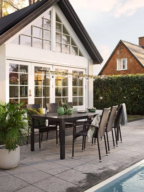 Vedlikeholdsfritt spisebord til terrassen eller uterommet. I aluminium med bordplate i nonwood. Mål: 205 x 90 cm, høyde 68 cm.
