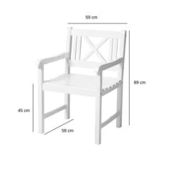 Skap et hyggelig samlingspunkt for sommerens middager i hagen, pü terrassen og uteplassen med en klassisk spisegruppe! Spisegruppe Risør er en stilren spisegruppe laget av FLEGT-merket, sertifisert og resirkulerbar mahogni som er malt hvitt med vÌrbestandig PU-maling for et elegant inntrykk. Skruene har combifix-hoder som er overflatebehandlet med messing, og gjengestengene bestür av rustbestandig jern. Spisegruppen bestür av en stabil sofa, to komfortable stoler og et rektangulÌrt spisebord i tidløs design. Nyt hele sommeren fra vürens første solstrüler til høstens regn og ruskevÌr. Oppbevar møblene innendørs om vinteren, eller beskytt dem med møbeltrekk. Mül: Bord: høyde 75 cm, dybde 80 cm, lengde 165 cm. Stol: høyde 89 cm, dybde 58 cm, lengde 59 cm, setehøyde 45 cm, setedybde 57 cm. Benk: høyde 89 cm, dybde 58 cm, lengde 1,5 m, setehøyde 45 cm, setedybde 57 cm. Maksimal vektbelastning: 120 kg.
