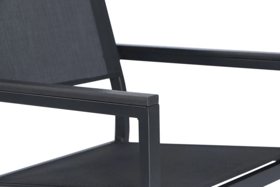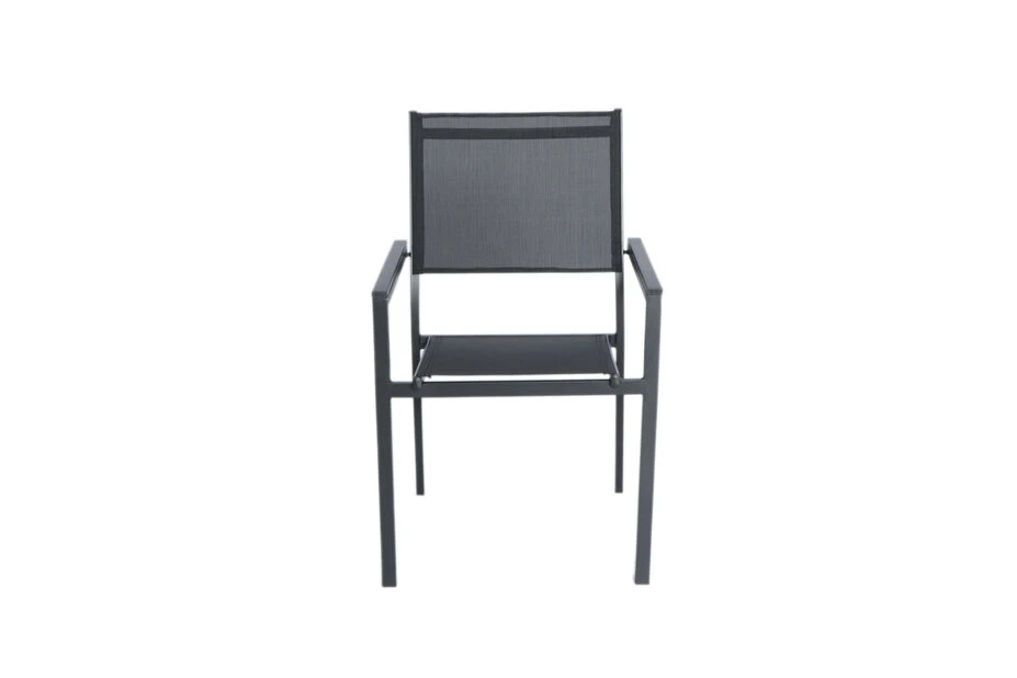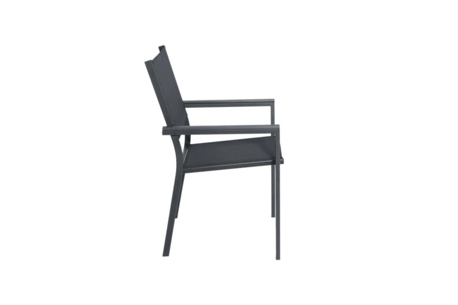 Moderne, lettplassert stol med armlene som passer i de fleste hager og er lett å matche med ulike spisebord. Rammen er i aluminium og setet i slitesterk, UV-bestandig textilene som er lettstelt og bare å tørke av. Som en vakker detalj er armlenet i vedlikeholdsfri nonwood. Stolen kan stables og er enkel å sette bort til oppbevaring. Maksimal belastning: 140 kg.