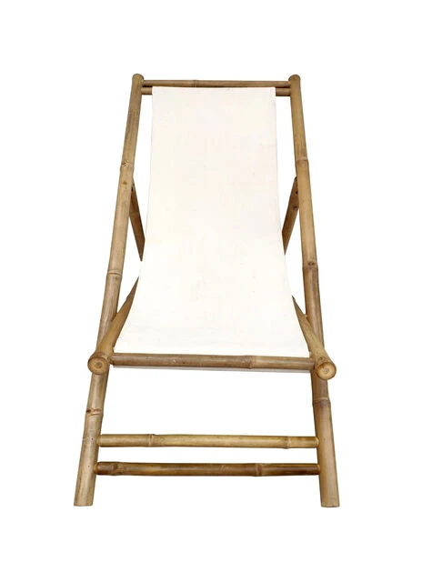 ⢠Klassisk, sammenleggbar strandstol i naturfarget bambus med slitesterkt, hvitt stoff.