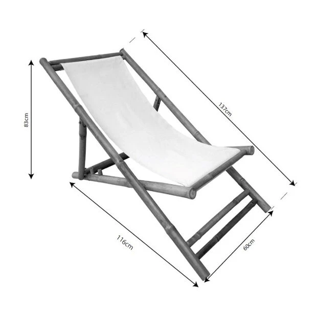 Skap et hyggelig rom i hagen, pü terrassen eller balkongen med komfortable utemøbler! Strandstol Manila Bamboo er en sammenleggbar strandstol i klassisk design med minimalistiske linjer og stilrene materialer. Strandstolens ramme er laget av stabilt bambustre som er forsynt med et robust stoff i slitesterk polyester som ikke blekes av solen og er lett ü tørke av. Møblenes innsatser bestür av galvanisert stül som er rustfritt med lang holdbarhet. Ettersom strandstolen er sammenleggbar, kan du enkelt flytte pü den, ta den med pü stranden eller slü den sammen og sette den bort nür du ikke trenger den. Strandstolens klassiske, minimalistiske design i naturlige farger gjør at den passer inn overalt og blir et uunnvÌrlig møbel som du kan nyte lenge! Mül: høyde 83 cm, bredde 60 cm, lengde 116/137 cm. Maksimal vektbelastning: 120 kg.