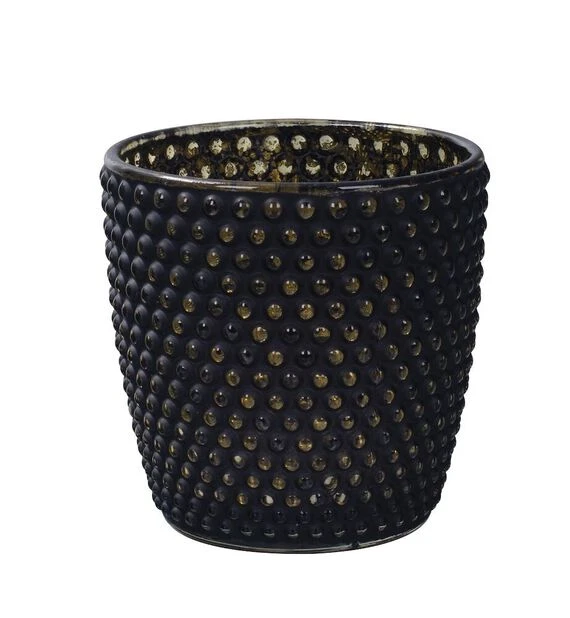Telysholder i svart glass med fint prikkemønster. Gullfarget innside som skaper et vakkert lysspill. Høyde: 7,5 cm, bredde: 7 cm. Fås i to størrelser.