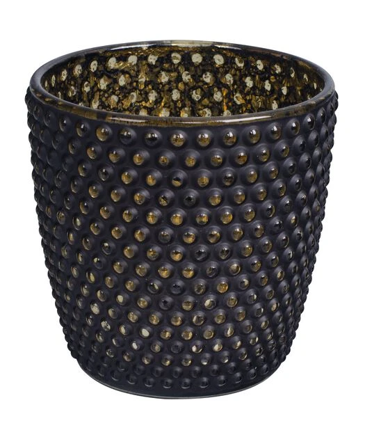 Telysholder i svart glass med fint prikkemønster. Gullfarget innside som skaper et vakkert lysspill. Høyde: 9 cm, bredde: 9 cm. Füs i to størrelser.