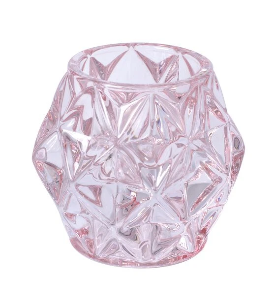 Moderne telysholder i lyserosa glass med fint mønster. Høyde: 7,5 cm, bredde: 8 cm.