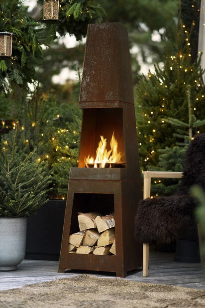 Nyt sene sommerkvelder og vakre vinterdager med en stilig utepeis! Inviter familie og venner for hygge og kos rundt de dansende flammene som også holder varmen i oss på kalde dager. Ildstedet Sanna er en stilig, pyramideformet utepeis i industriell stil som kan stå ute i hagen året rundt. Peisen er produsert i cortenstål og har et praktisk kammer for oppbevaring av ved helt nederst. Cortenstålet vil med tiden ruste, men det er faktisk et beskyttende lag som gjør stålet enda mer holdbart og gir peisen en fin patina. Utepeisen har også en praktisk askeoppsamler som gjør det enkelt å rengjøre.