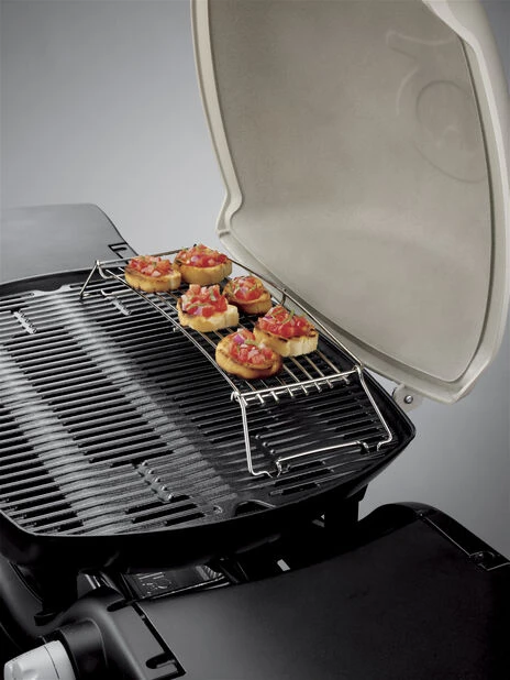 Smart varmehylle som lÞfter maten fra grillristen og gir deg ekstra plass Ä arbeide pÄ, nÄr du for eksempel griller bruschetta. Passer til Q 3000-serien.
