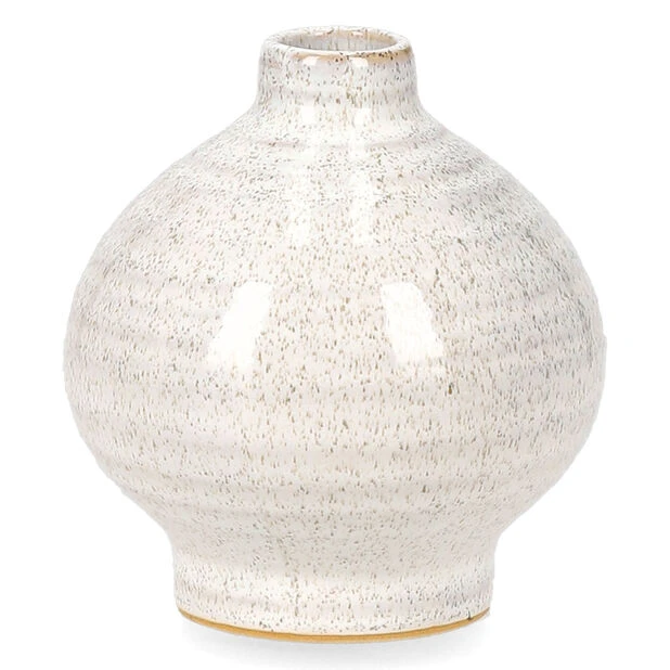 Fin, rund vase av keramisk leire. Vasen har en behagelig, blank glasur og mykt prikkete mønster. Fyll vasen med blomster og strå eller plasser den som den er på en fin plass! Mål: 12,5×12,5×13,5 cm.