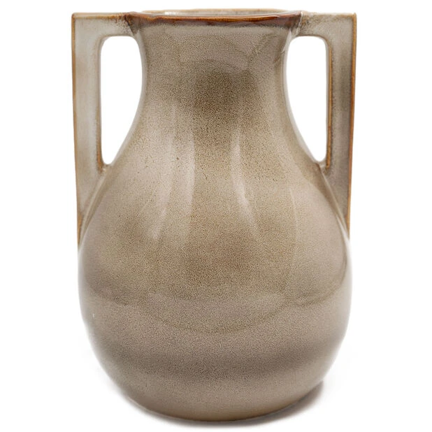 Dekorativ, beige vase med doble håndtak i blankpusset keramikk. Perfekt til både blomstrende og grønne snittblomster eller la vasen pryde innredningen som et ornamentalt innslag i hjemmet. Mål: Ø22,5 cm, høyde: 31 cm.