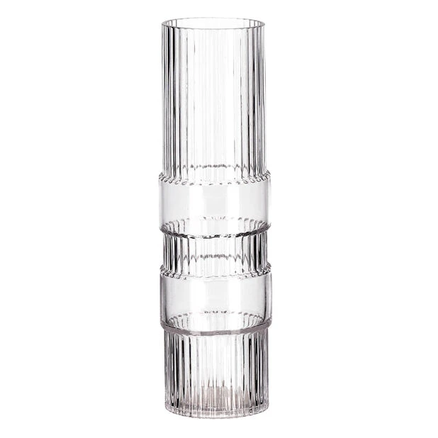 Denne vasen i glass er like vakker som et kunstverk! Fyll med blomster eller bruk som dekorasjon. Riller og transparent glass som danner en moderne sylinderformet vase. Høyde: 29 cm, ø8 cm.