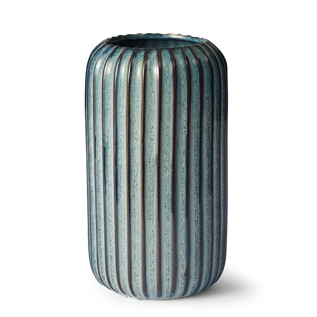 Moderne, håndlaget keramikkvase med blått strukturmønster. Passer for både enkle og overdådige blomsteroppsatser. Diameter: 10,5 cm, høyde: 19 cm.